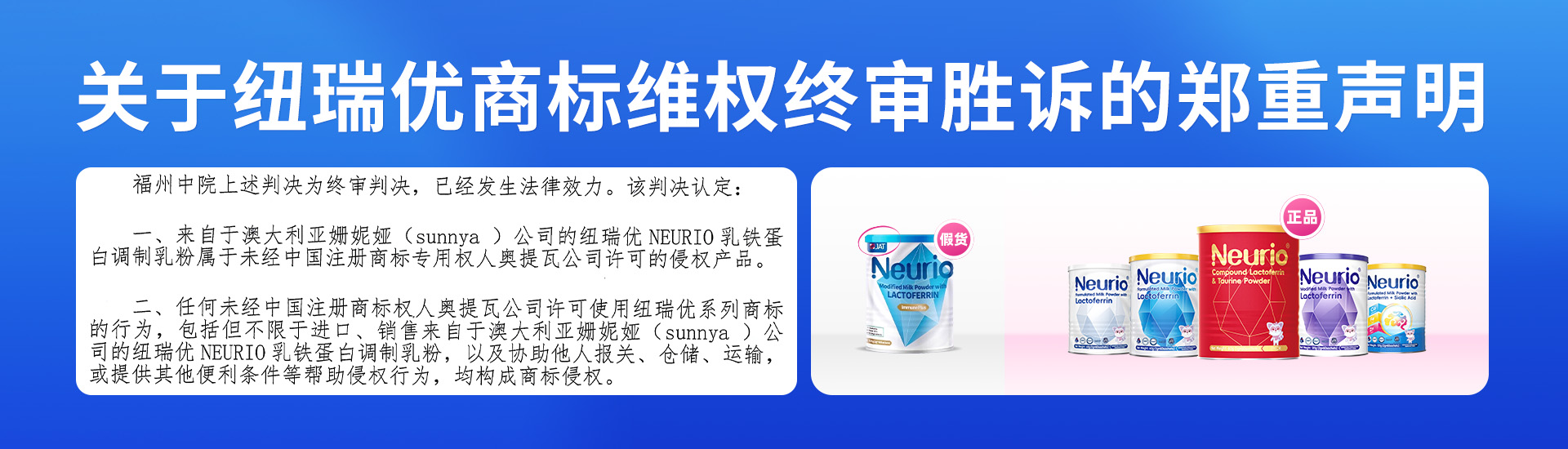 Neurio (中文品牌名:紐瑞優)意即 “New for You(創新為你)” ,自2011年品牌創建以來, 秉承“創新為你·健康至上” 的理念,讓健康伴隨生活。 紐瑞優Neurio產品從國際引入中國,快速落地生根,并在中國實現品牌騰飛!紐瑞優持續努力將自己打造為一個國際知名品牌,前期主要以澳新產品為主,現已轉型為以國際產品為主,并堅定不移深耕中國本土化產品,擴大國際營銷, 實現從國際引進中國,再從中國走向國際,讓紐瑞優品牌再上一個新的臺階! 自2015年,紐瑞優團隊經過不懈努力成功研發紐瑞優乳鐵蛋白系列調制乳粉,奉獻給熱愛健康的人們。 紐瑞優團隊專注大健康理念,包括孕產婦與胎兒健康,兒童青少年的健康成長以及中老年人的健康營養需求,不斷推陳出新,為大健康理念貢獻自己的一份力量。 紐瑞優永不止步,不斷探索和追尋更新的健康理念,不斷自我超越追求更高的目標, 不斷努力研發生產符合市場需求的質優價美產品,滿足人們對健康和高品質生活的追求!